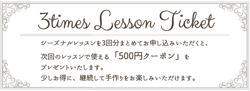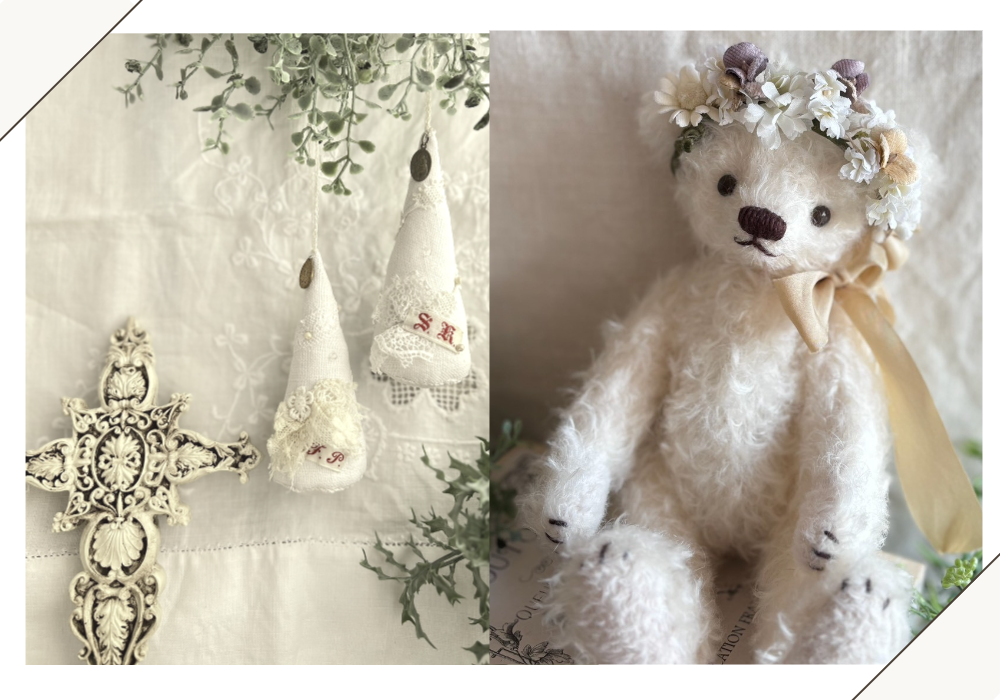 テディベアを中心に、布花や小さな雑貨など、季節の小物を作るクラスもあります。お好みのクラスをお選びください。